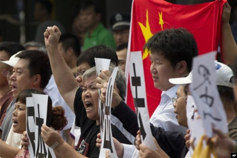 Dân Trung Quốc biểu tình bên ngoài Đại sứ quán Nhật Bản tại Bắc Kinh với các biểu ngữ "Hãy tuyên chiến với Nhật Bản", và "Nhật Bản hãy cút khỏi đảo Ðiếu Ngư', ngày 17/8/2012
