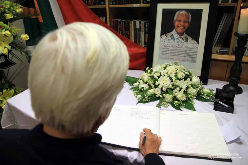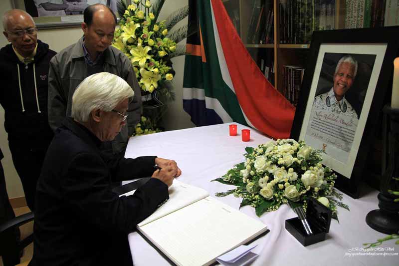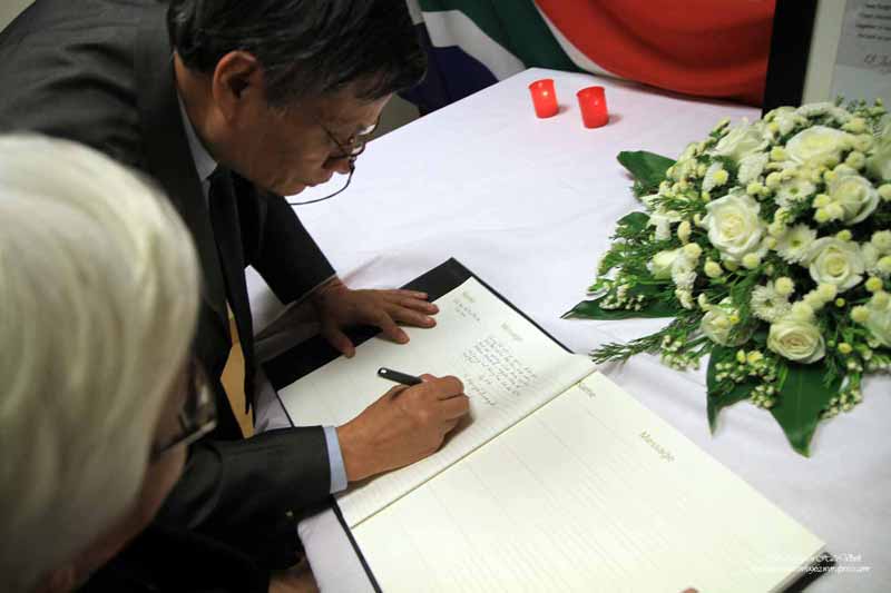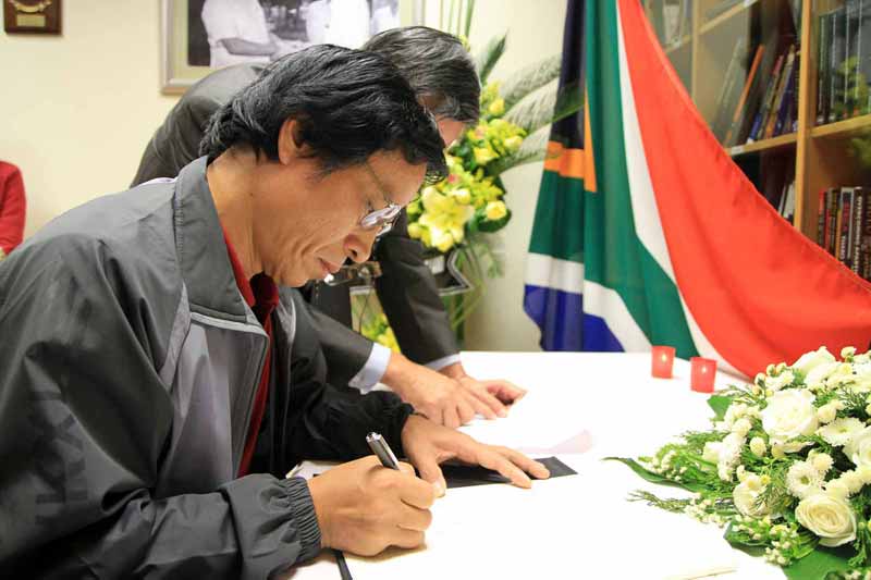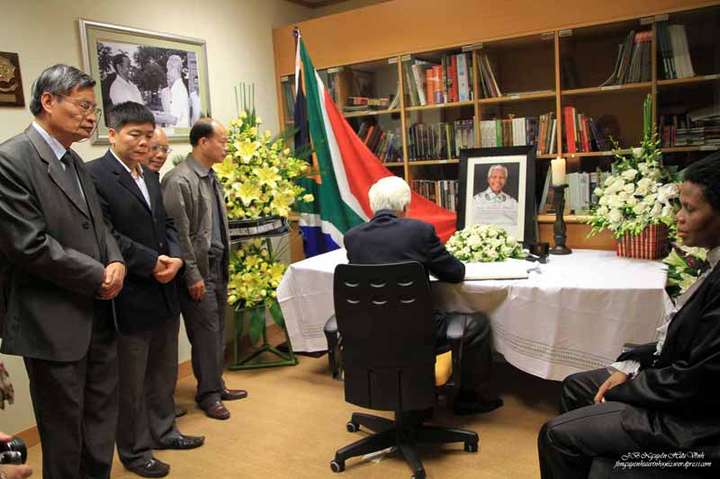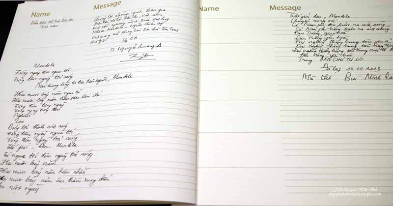 Ghi vào sổ tang dòng chữ như sau: “Chúng tôi, những người tham gia Diễn Đàn Xã Hội Dân Sự Việt Nam kính cẩn nghiêng mình trước anh linh Nelson Mandela, người chiến sĩ vinh quang của phong trào dân chủ trên toàn thế giới”. Đặc biệt, đoàn còn ghi bài thơ của Nhà thờ Bùi Minh Quốc gửi từ Đà Lạt để kính viếng Nelson Mandela. Bài thơ như sau: